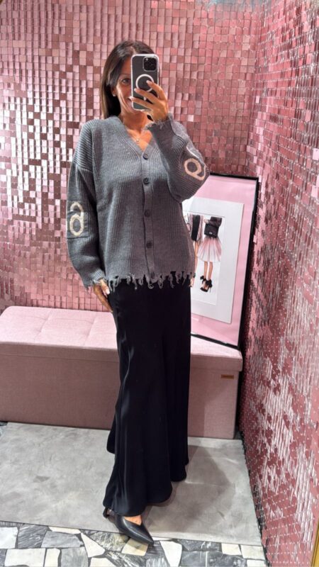 Un mix perfetto di comfort e stile, ideale per chi cerca un outfit versatile che non rinunci alla personalità. Il cardigan VICOLO con rotture aggiunge un tocco di carattere, mentre la gonna lunga in viscosa garantisce fluidità e movimento. Le decolletè Divine Follie completano il look con un’eleganza senza tempo.