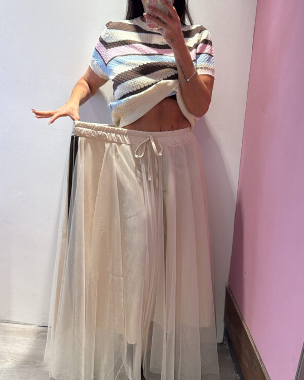 Il tulle aggiunge movimento e una femminilità più delicata. La lunghezza midi slancia la figura e la banda in vita definisce la silhouette, rendendo l’outfit più equilibrato.