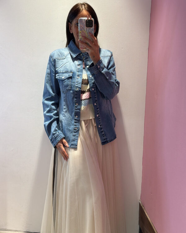 È il capo che cambia tutto. Il denim spezza la delicatezza del tulle e rende il look più quotidiano e facile da indossare. Puoi portarla aperta, come una giacca leggera, oppure chiusa per un effetto più pulito.