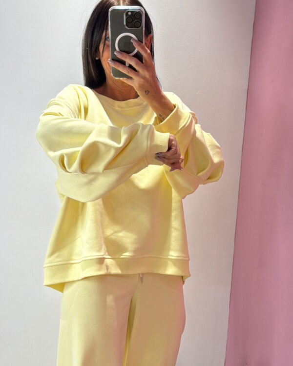 Ci sono outfit che non hanno bisogno di troppi elementi per funzionare. Questo è uno di quelli. Il coordinato composto da felpa over Vicolo basic giallo pastello e pantalone a palazzo con coulisse punta tutto su una cosa: far stare bene, senza rinunciare allo stile.