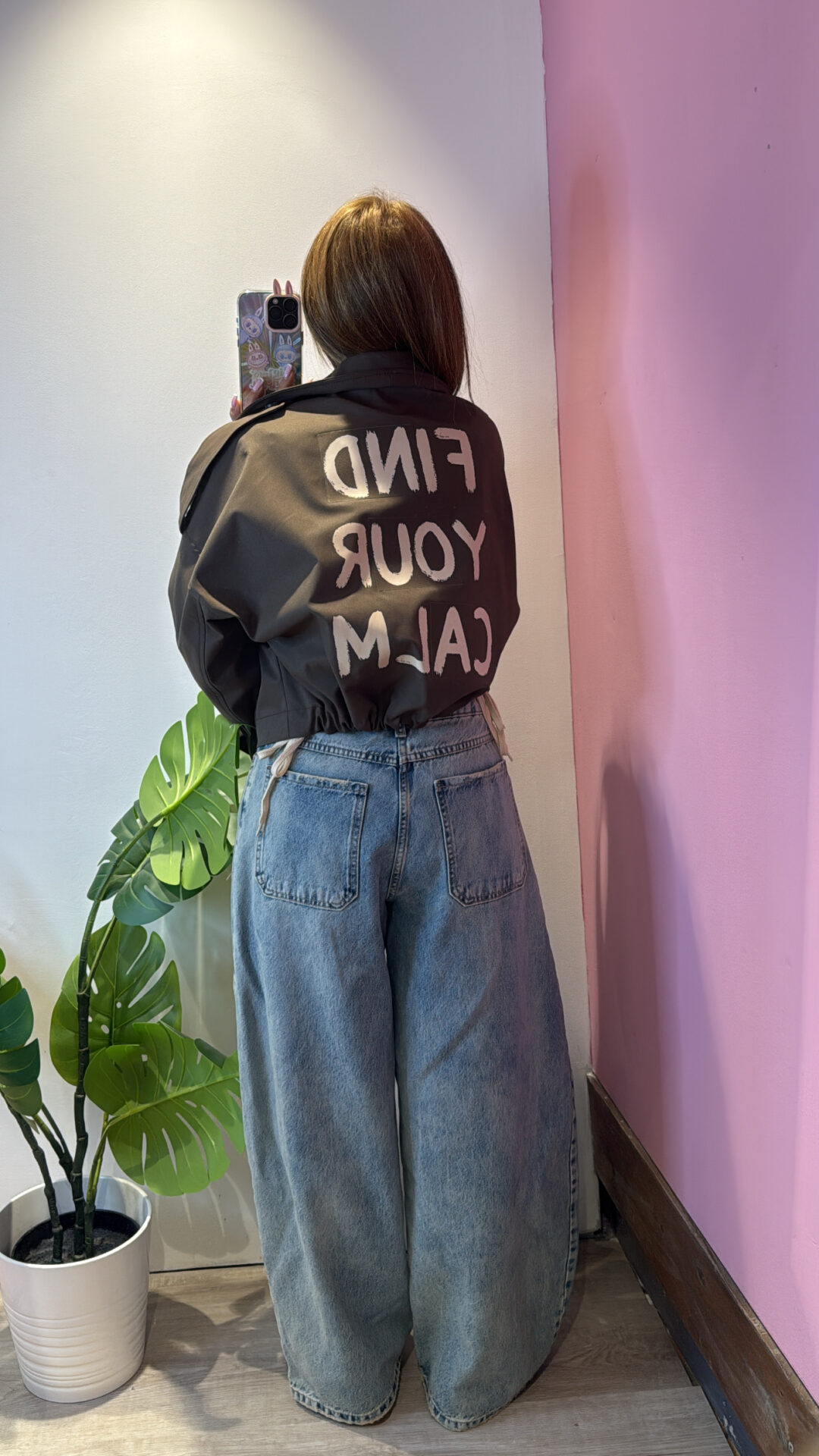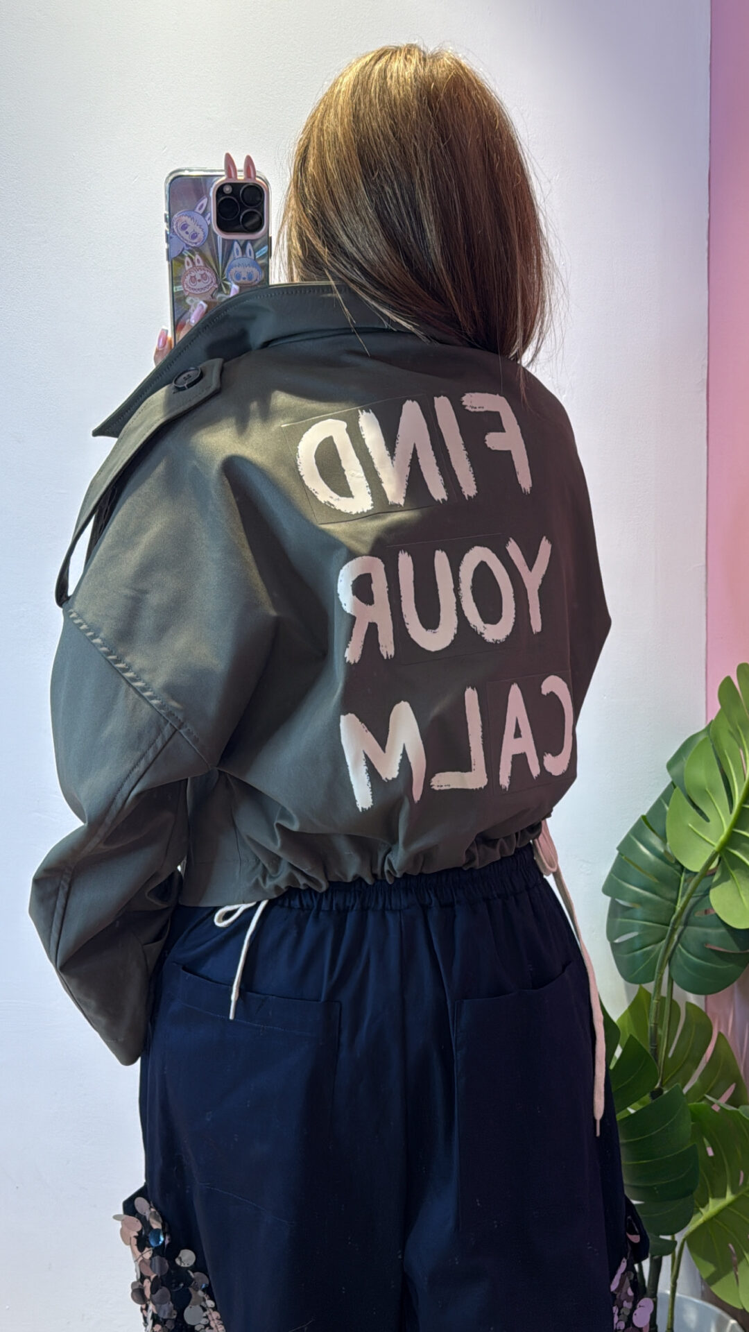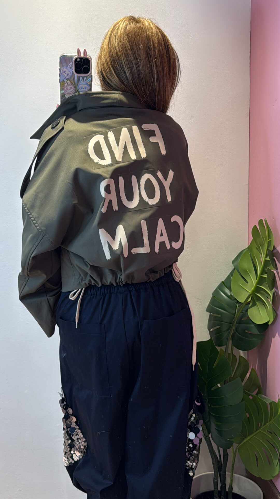 Bomber VICOLO con collo a rever , doppio petto . Particolare la scritta sul retro ” FIND YOUR CALM ”