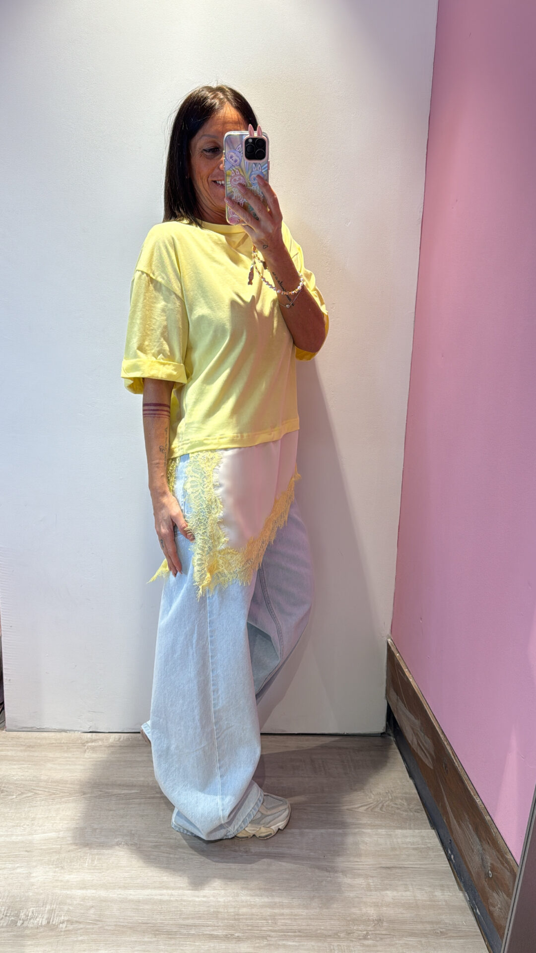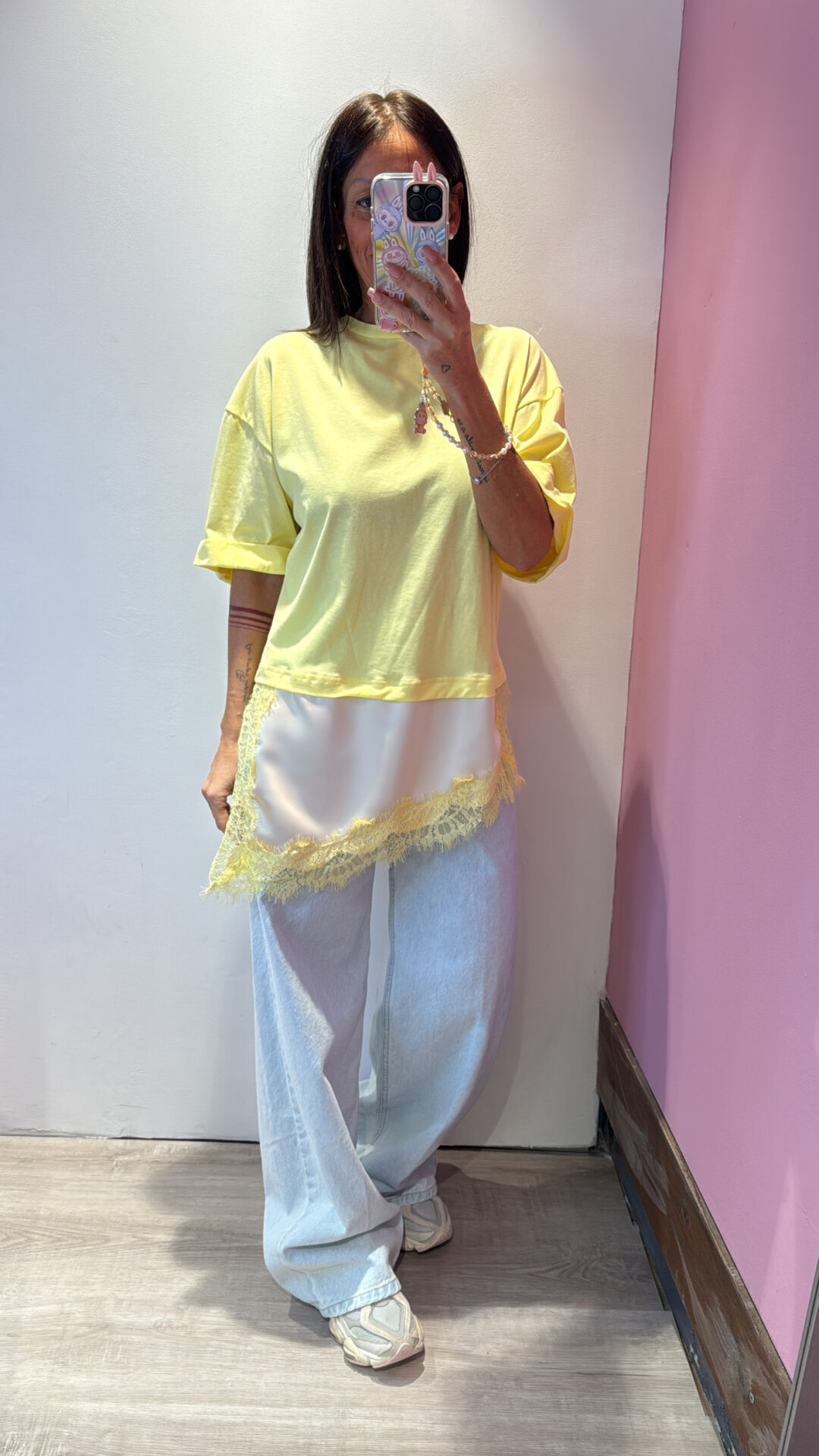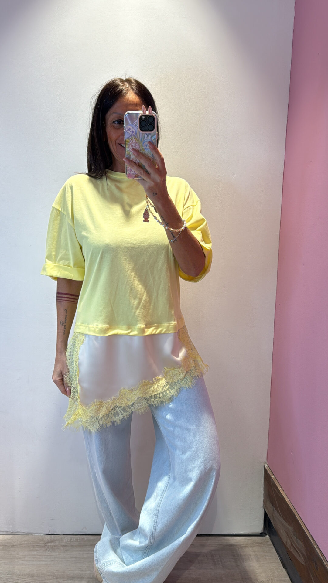 T-shirt MOTEL girocollo asimmetrica con raso & pizzo a contrasto