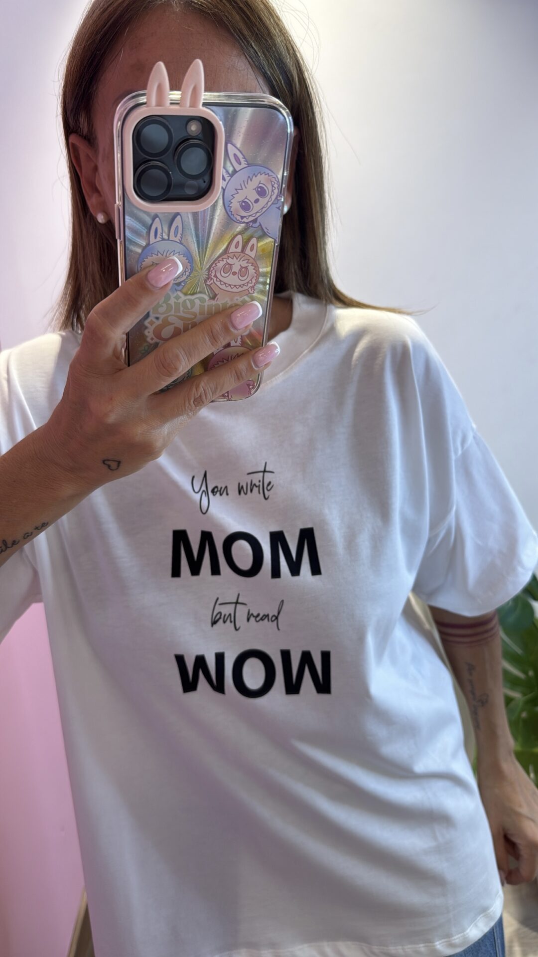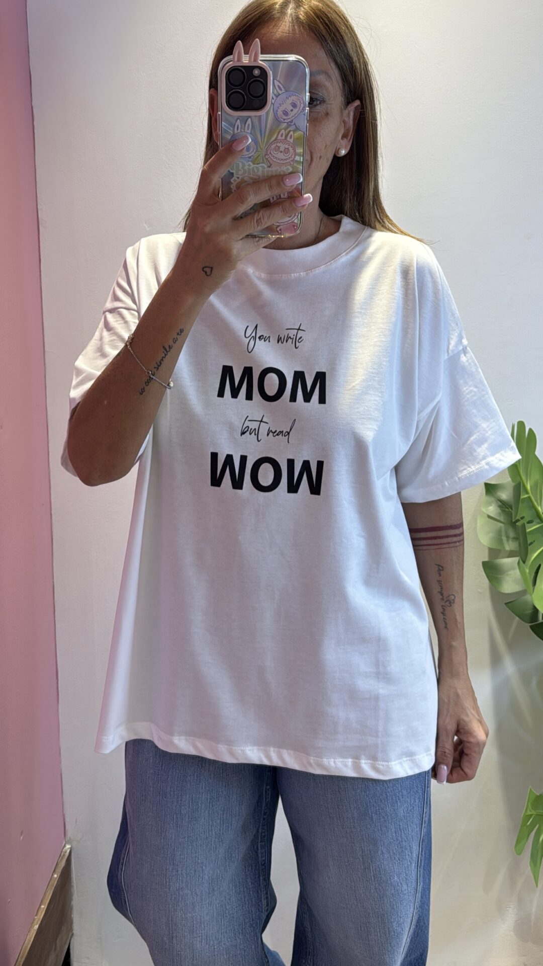 T-shirt Over VICOLO girocollo con scritta you write MOM but wear WOW