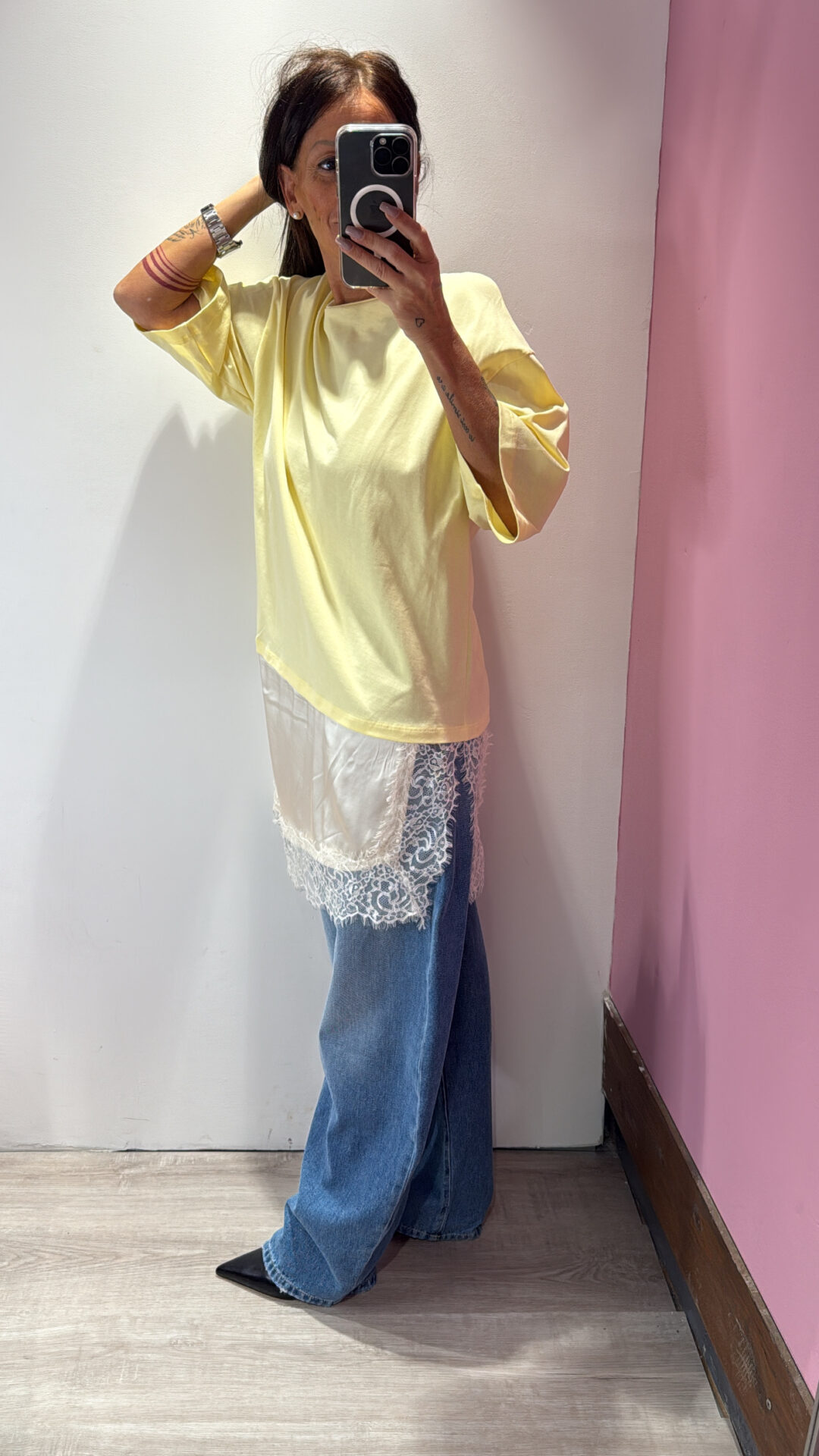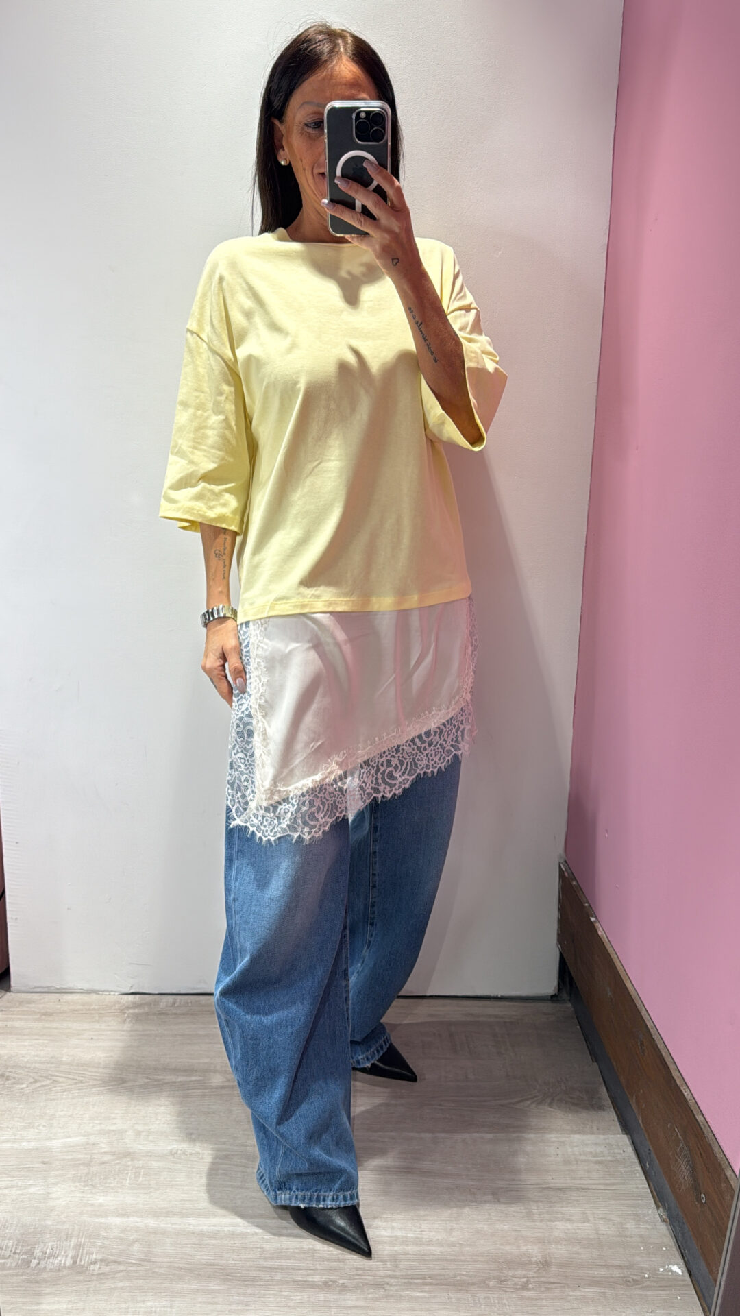 T-shirt VICOLO girocollo asimmetrica con raso & pizzo a contrasto
